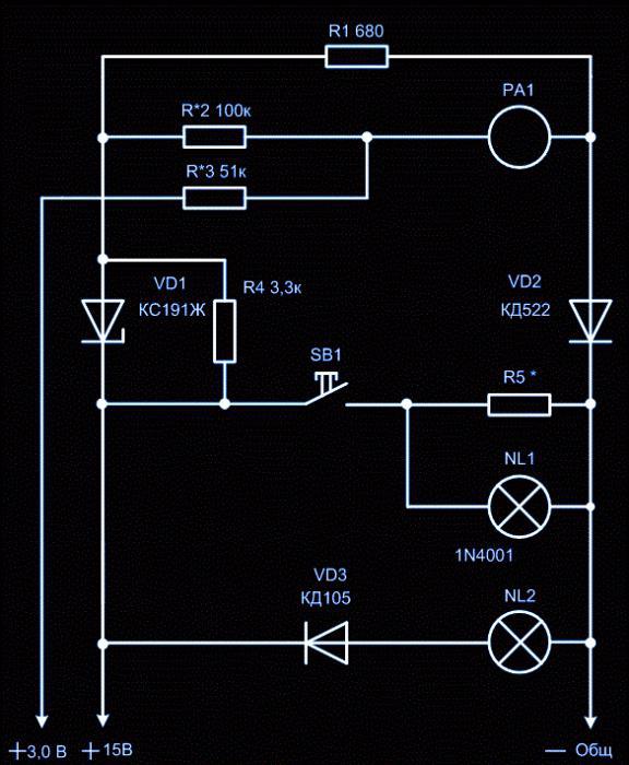 La lecture actuelle de l'appareil augmentera dès que les valeurs de tension deviendront supérieures au niveau d'ouverture de la diode zener. Lors de l'application d'une tension de mauvaise polarité, les diodes assurent la protection. Dans l'image: SB1 est l'interrupteur à bascule, R1 est le transmetteur du courant requis, R2 et R3 sont des résistances conçues pour M3240, R4 est le déterminant de la largeur des plages étroites des balances, R5 est la résistance de charge.
