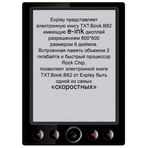 - Explay TXT.Book.B60 prend en charge 9 formats de texte populaires, y compris PDF, TXT, FB2, RTF et autres. La mémoire interne contient 2 Go et a la capacité d'étendre jusqu'à 16 Go grâce à la présence d'emplacements supplémentaires (prise en charge des cartes SD, SDHC). Technologie Matrix - E-ink Pearl, la taille de l'écran est de 6 pouces.