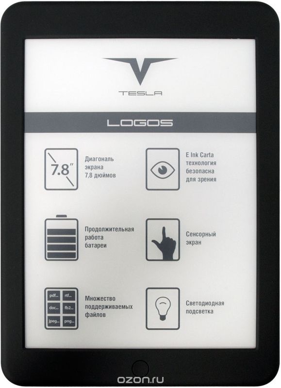 - Tesla Logos TL708 utilise un revêtement doux au toucher sur l'écran E-Ink Carta de 7,8 pouces, reconnaît tous les formats de texte. 16 Go de mémoire interne suffisent pour charger toute la bibliothèque du district. Il y a un écran rotatif, vous permet d'installer diverses applications de lecture. Prix 13 790 p.