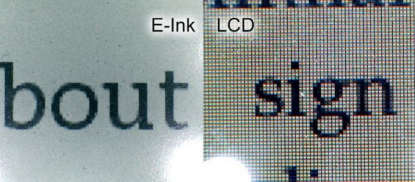 Comparaison d'écrans de même résolution: à gauche un livre électronique, à droite l'écran à cristaux liquides d'une tablette classique
