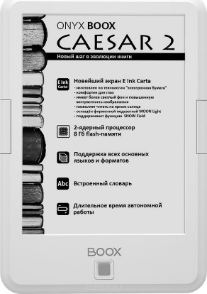 - Boite en onyx Caesar 2 est le premier du classement des livres électroniques sur l'ozone. Boutons pratiques, rétroéclairage intégré avec réglage en douceur, résolution d'écran de 1024 × 768, 8 Go de mémoire interne et prise en charge des cartes jusqu'à 32 Go. Le prix est moyen, 6490. Ce livre est destiné aux amateurs de lecture, il est possible de changer les polices, de faire des signets, et d'augmenter l'échelle.