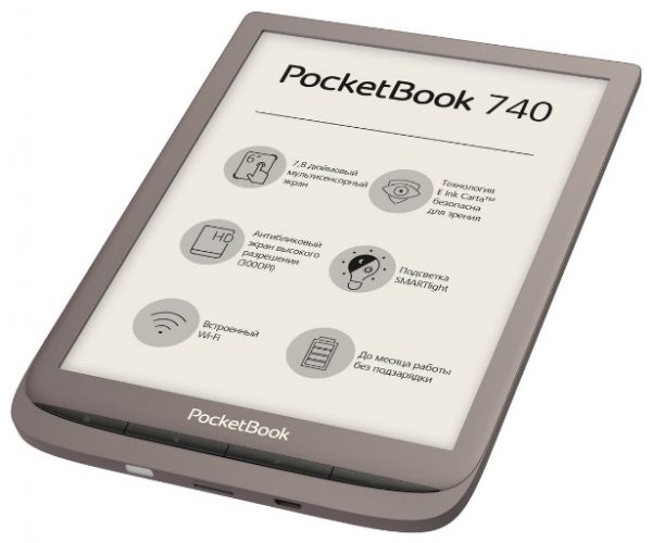 - Le PocketBook 740 peut se synchroniser avec tous les appareils des utilisateurs, se rappeler que la page n'est plus nécessaire. Le rétroéclairage sur le côté n'est pas frappant. L'écran change la température de couleur, dans les paramètres, vous pouvez connecter une option quand il se réchauffe le soir. Il est confortable pour le système nerveux et facilite l'endormissement. Prend en charge les cartes mémoire jusqu'à 32 Go, diagonale 7,8.
