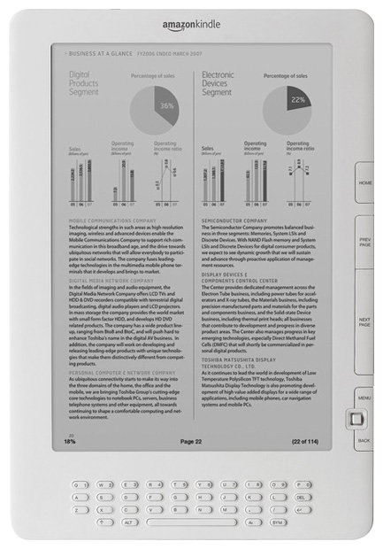 Le premier appareil commercialisé par la société sous sa propre marque est un livre électronique. L'appareil s'appelait Kindle et a été lancé en 2007 au prix de 399 $. Le premier lot s'est dispersé en seulement 6 heures et a connu un succès retentissant. Le lecteur était innovant à sa manière, au bas du boîtier, il y avait un clavier pour saisir du texte et rechercher des livres dans le gestionnaire de fichiers, et sur les faces latérales, il y avait des boutons mécaniques pour tourner les pages. Initialement, l'appareil n'était vendu qu'aux États-Unis, mais cela ne l'a pas empêché de gagner en popularité dans le monde entier, car à partir de la deuxième génération, il a été vendu partout.