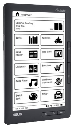 La capacité de mémoire interne de 8 Go peut être complétée par un lecteur flash jusqu'à 32 Go. La capacité de la batterie vous permet de lire jusqu'à 10 000 pages sans recharger, ce qui est comparable au produit phare d'Asus - le modèle DR-900. Un autre avantage en faveur de ce lecteur est le temps de charge rapide. Cela prend environ 3 heures. Coût à partir de 6790 roubles.