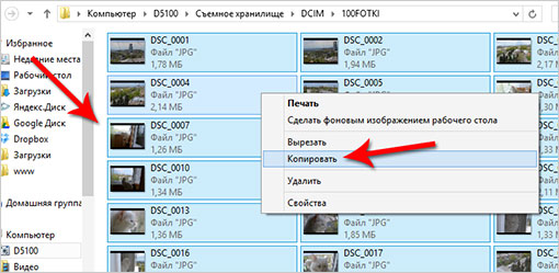 Vous pouvez maintenant ouvrir le disque amovible en cliquant dessus et y trouver le dossier DCIM, dans lequel se trouvent les données dont nous avons besoin. Nous créons un dossier avec le nom sur le bureau, maintenant il suffit de sélectionner les fichiers nécessaires, appuyez sur le bouton droit de la souris et sélectionnez copier dans le menu. Accédez au nouveau dossier créé, appuyez à nouveau sur le bouton droit de la souris et sélectionnez l'option pour insérer une photo sur un ordinateur portable ou un ordinateur dans le menu. Il reste à attendre que les données souhaitées soient copiées, après quoi vous pouvez effacer le lecteur flash USB pour de nouvelles photos.