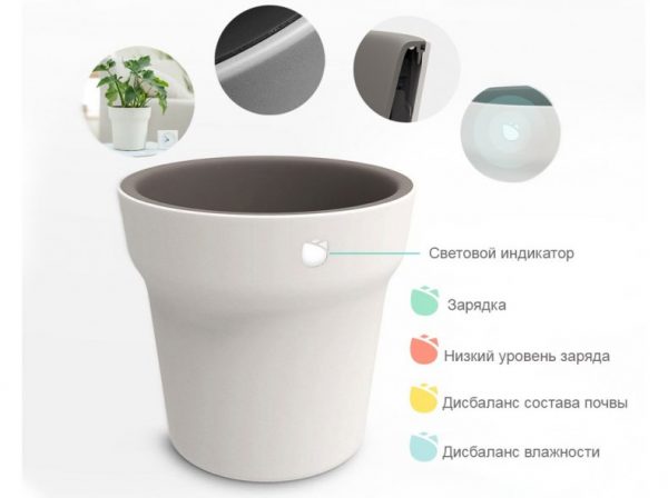 Les pots d'origine sont connectés au smartphone via Bluetooth et transmettent des données sur l'humidité de la terre et ses propriétés. La base de données de l'application mobile stocke des données sur la prise en charge de plus de 3 000 espèces de plantes. Dès que la fleur a besoin d'attention, les capteurs sur le pot vous le rappelleront. Une batterie de 350 mAh détient une charge de 3 à 6 mois, selon la fréquence à laquelle le pot s'associera avec le téléphone.
