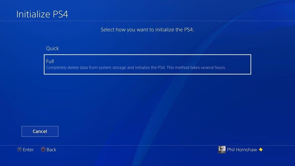 - Ouvrez le menu «Initialisation». Après être allé à la section des paramètres, vous devez faire défiler vers le bas jusqu'à ce que l'option souhaitée soit visible. Après ouverture, appuyez sur «Initialiser le système PS4». Cliquez sur "Complet", après quoi la console commencera le processus de réinitialisation. L'utilisateur doit suivre les instructions affichées à l'écran.