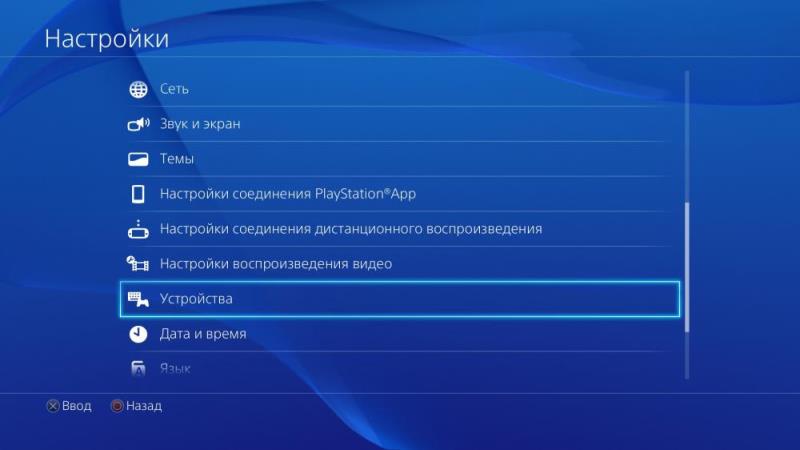 - Allez dans le menu de la console, sélectionnez la colonne "Paramètres". Dans cette liste, sélectionnez «Périphériques» puis «Périphériques audio».