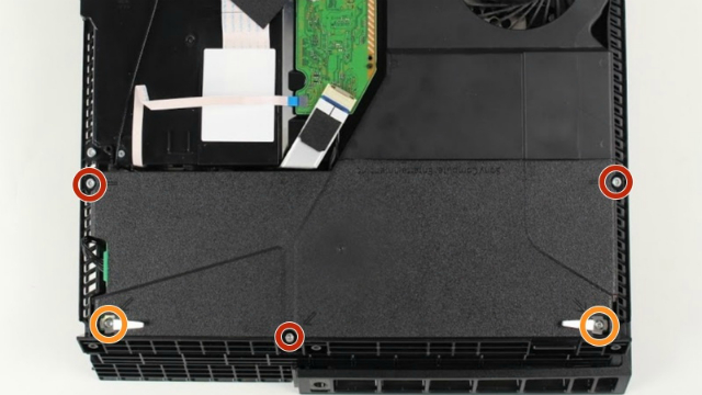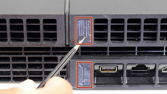 - Le processus de démontage de la console commence par le fait que vous devez tourner la PS4 sur le capot arrière. Avec des pincettes, les autocollants de protection (4 pièces) sont enlevés. Après avoir retiré les autocollants, vous aurez accès aux 4 vis d'un diamètre de 9 mm, qui doivent être retirées avec un tournevis Torx. Après avoir retiré l'autocollant, la garantie sur la console sera automatiquement annulée.
