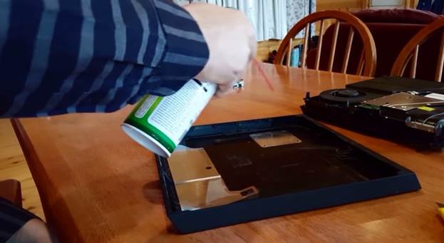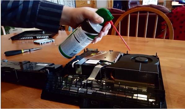 - Pour vous débarrasser complètement de la poussière, vous devez souffler tout le corps avec des courants d'air. Il n'est pas recommandé de diriger l'air verticalement vers le corps. Retirez la saleté de tous les composants de l'appareil. Vous ne devez en aucun cas faire sauter le connecteur du lecteur situé à l'avant. Rincer le lecteur le détruira et la console cessera de fonctionner. Avant de souffler la console, il est recommandé de tourner un peu le ventilateur pour laisser sortir la poussière extérieure. Un coton ou un bâton convient également à cela.