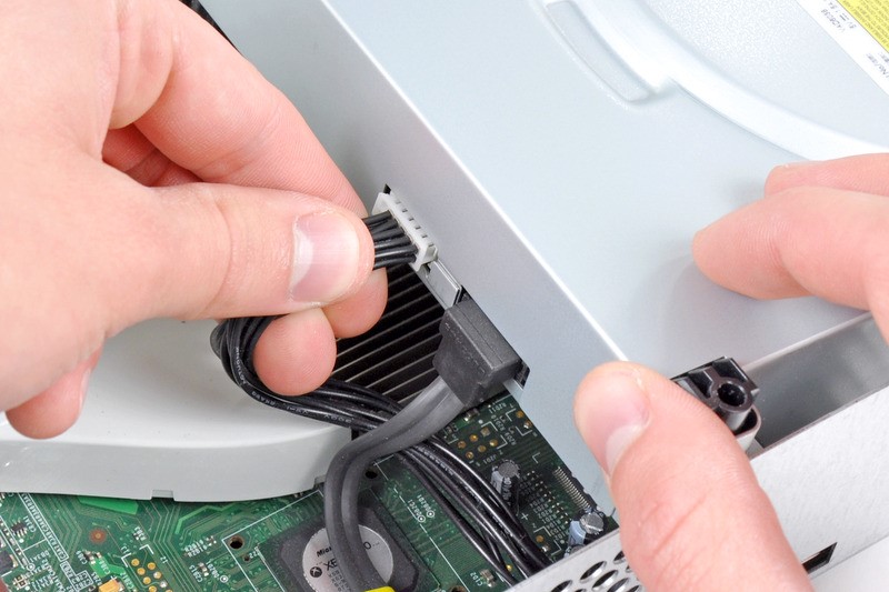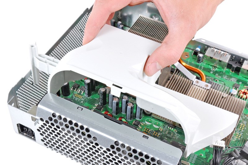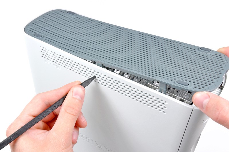 Le panneau latéral de la console peut être retiré de la même manière que les panneaux inférieur et supérieur - en appuyant sur les «languettes» des loquets à travers les trous de ventilation. Une fois déplacées, les poches de corps XBOX360 peuvent être facilement déconnectées les unes des autres.