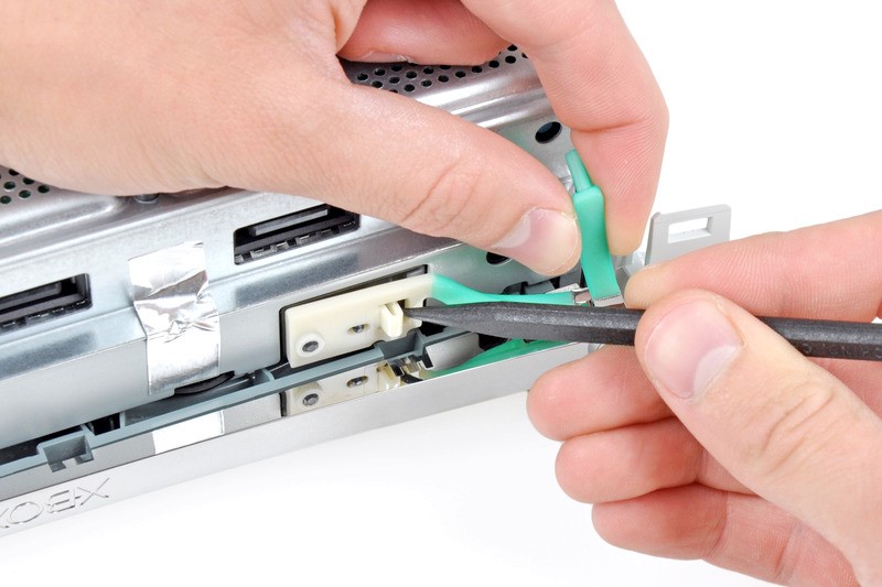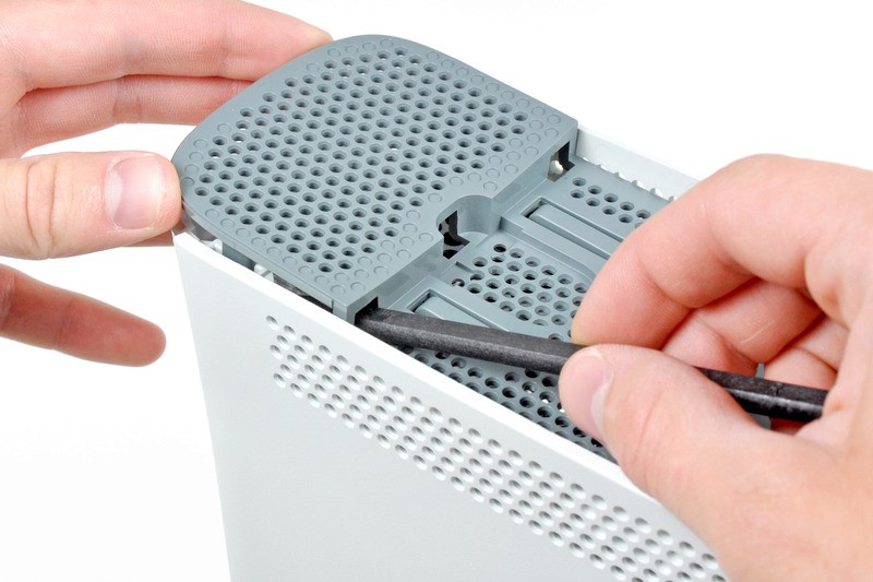 À travers les nombreuses ouvertures du boîtier de la console, les loquets et les clips de la "grille" de ventilation inférieure sont visibles - pour retirer le panneau, ils doivent être légèrement pliés avec un poinçon. Le panneau du gril lui-même est tiré vers le haut.