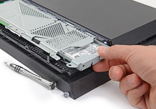 - Au lieu de l'ancien, la base est remplacée par un disque dur remplacé pour les jeux sur la console PS4pro. Une fois l'installation du lecteur terminée, vous devez remettre toutes les vis, car un disque dur non sécurisé se détériorera lors du déplacement ou du transport.