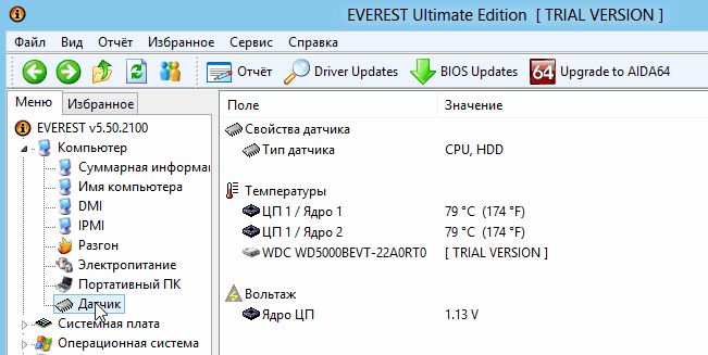 Après l'avoir installé et démarré, vous devez vous rendre dans la section «Ordinateur / Capteur», qui contient des données sur la température du processeur et du disque dur.Ces indicateurs, bien qu'indirectement, indiquent le régime de température de l'appareil.