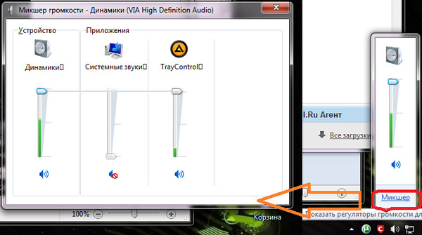 Tout d'abord, vous devez vérifier les commandes de volume de l'ordinateur portable. Faites attention à la barre des tâches: il devrait y avoir une image d'un haut-parleur qui est responsable du fonctionnement des haut-parleurs. Cliquez dessus et voyez dans quelle position se trouve le curseur. Vous l'avez peut-être accidentellement abaissé jusqu'en bas et avez coupé le son. Vous pouvez cliquer sur le modèle de haut-parleur avec le bouton droit de la souris et dans le menu contextuel arrêter sur l'option pour ouvrir le mélangeur de volume. Les enceintes et le système doivent être réglés au maximum.
