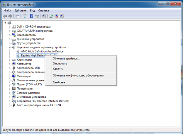 Si vous avez fait tout ce qui précède, mais que la musique n'est pas apparue, les pilotes ont cessé de fonctionner. Dans le panneau de configuration, ouvrez le "Gestionnaire de périphériques". Ensuite, tous les appareils sonores. Ensuite, faites un clic droit sur l'un des pilotes, ouvrez le menu et mettez-le à jour. S'il ne montre pas que des mises à jour sont nécessaires, vous devez arrêter les pilotes dans le même menu, puis les redémarrer. Ainsi, il est facile de restaurer leur travail. Ensuite, l'ordinateur portable doit être redémarré.