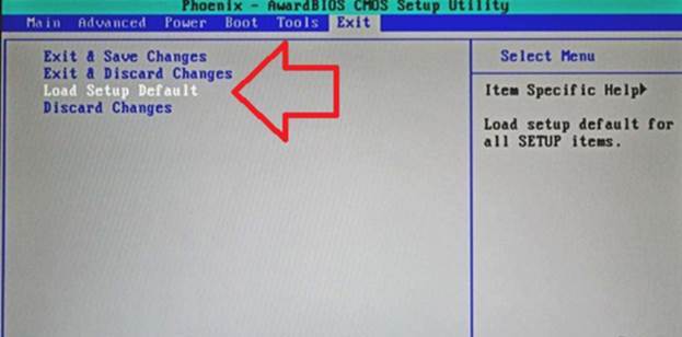 En cas de problèmes de commutation, il est recommandé de réinitialiser tous les paramètres du BIOS aux paramètres d'usine. Pour résoudre ce problème, il est recommandé que lorsque vous allumez l'ordinateur portable, accédez au BIOS (appuyez sur Ф9, Ф11 selon le modèle) et réinitialisez tous les paramètres aux paramètres initiaux.