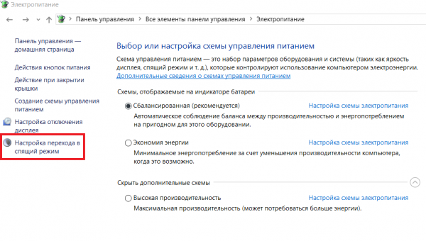 - Pour désactiver le mode spécial dans la partie gauche de cette fenêtre, cliquez sur le lien "Réglage de la transition en mode veille".