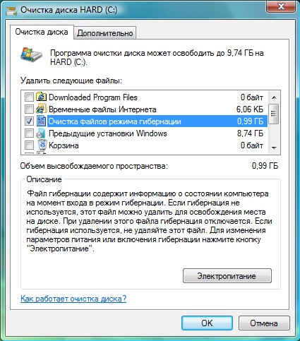 - Dans la fenêtre que vous voyez, vous devez cocher la case à côté de l'élément "Effacer les fichiers en mode hibernation" et accepter.