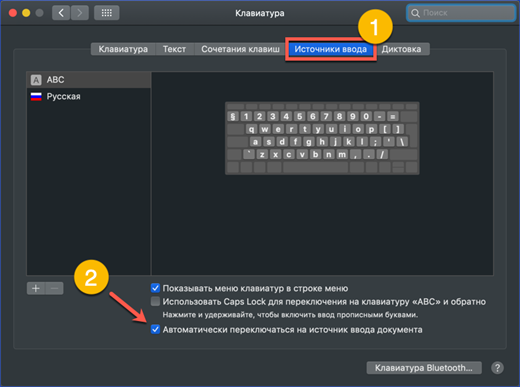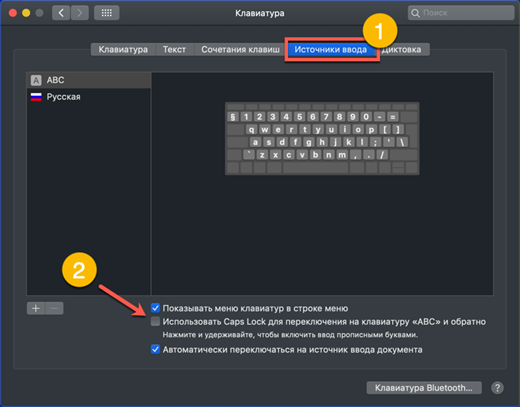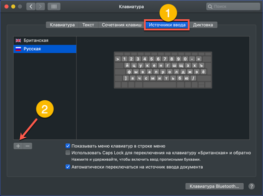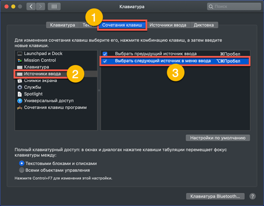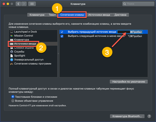 - Après avoir ouvert les paramètres du clavier, dans le menu supérieur de la fenêtre, nous sélectionnons l'onglet indiqué par le numéro "1". Sur le côté gauche, nous trouvons la section "Sources d'entrée". Dans la partie droite de la fenêtre, sélectionnez l'élément responsable de la modification de la source d'entrée. En cliquant sur la zone indiquée par la flèche, nous activons une fenêtre avec une combinaison clavier. La capture d'écran montre comment remplacer la combinaison système standard par celle utilisée précédemment dans macOS.