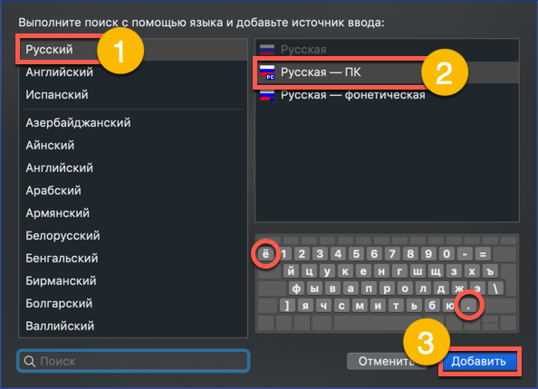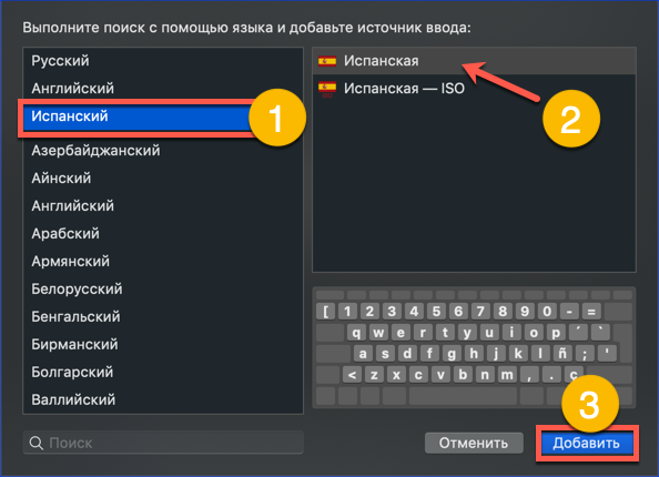 - La partie gauche de la fenêtre contextuelle répertorie les modules linguistiques disponibles pour l'installation. Nous trouvons le bon parmi eux. Après l'avoir sélectionné, sur le côté droit, nous voyons des dispositions. Indiqué par le numéro "2" standard pour les ordinateurs Apple. Nous le marquons et terminons l'action en cliquant sur le bouton "Ajouter".