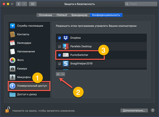 - Dans la partie gauche de la fenêtre, la zone "Accès universel" s'ouvre. Les programmes qui y sont entrés sont considérés comme fiables et ils sont autorisés à contrôler l'ordinateur. Pour ajouter un Punto Switcher, vous devez cliquer sur l'icône «+» et le sélectionner dans la liste des installés. L'interrupteur en face de l'icône du programme doit être marqué d'une coche. Ainsi, nous lui permettons de démarrer automatiquement au démarrage du système d'exploitation et de contrôler la commutation des mises en page.