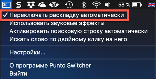 - L'icône Punto Switcher s'affiche dans la barre de menu supérieure. En cliquant dessus, nous développons les paramètres de base. Nous vérifions que le mode de commutation automatique est activé.