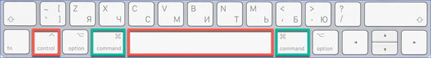 L'utilisation de raccourcis clavier est un moyen plus rapide et plus pratique de changer de disposition. Cette option est utilisée par la plupart des utilisateurs. Sur tous les ordinateurs Mac avec macOS Sierra ou un système d'exploitation plus récent installé, la combinaison de touches Ctrl + Spase est utilisée pour changer la langue d'entrée. Dans la capture d'écran, ils sont indiqués en rouge. Dans les versions antérieures de macOS antérieures à 2016, le bouton de commande était utilisé à la place de contrôle.