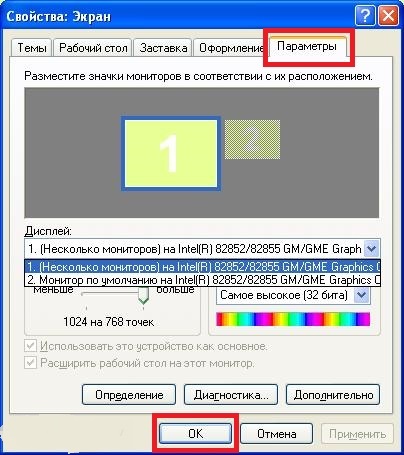 Pour étendre les fonctions, vous pouvez ouvrir le menu «Résolution d'écran», dans le menu qui s'ouvre, vous pouvez clairement voir les deux écrans, régler leurs indicateurs et sélectionner le principe de fonctionnement séparément.