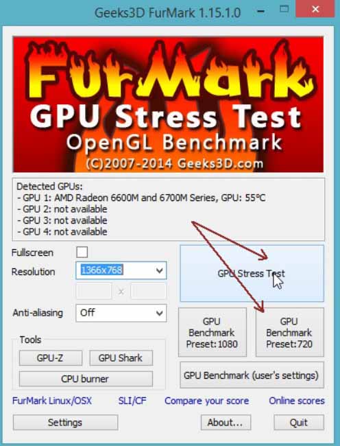 Après l'installation, ouvrez-le. L'écran principal affiche toutes les cartes vidéo. Avant de commencer le test, sélectionnez la résolution (standard 1366x768). Pour démarrer le test, cliquez sur le bouton "CPU Benchmark Present 720" ou "CPU Stress test".