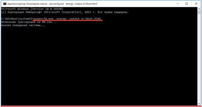 Le lancement doit être effectué au nom de l'administrateur. Ensuite, entrez la valeur "powercfg.exe -energy -output d: \ Nout.html", où d: est le nom du lecteur local (peut être indiqué par une lettre différente).