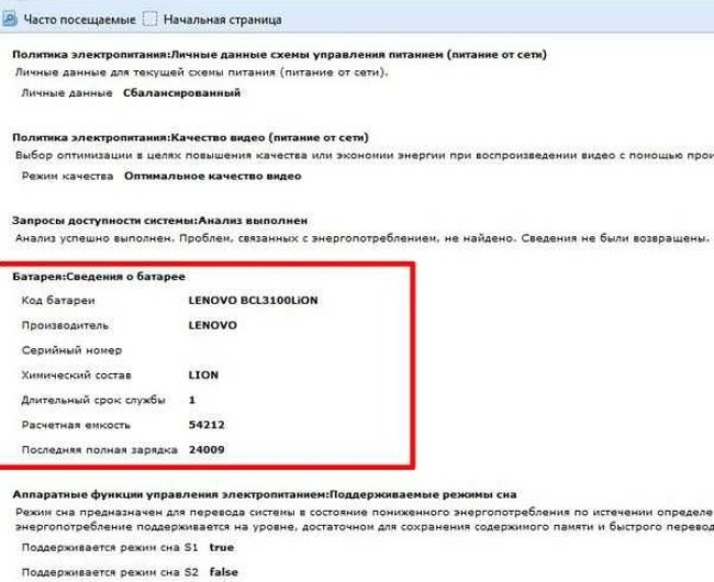 Ce fichier doit être ouvert à l'aide de n'importe quel navigateur et faire défiler jusqu'à la section "Informations sur la batterie". Ensuite, vous devez comparer l'indicateur de la dernière charge complète et la capacité estimée. Si la première est nettement inférieure à la seconde, la batterie doit être calibrée sans faute.
