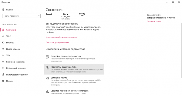 - Entrez le bloc "Réseau et Internet" dans la fenêtre "Paramètres Windows", qui peut être ouvert en appuyant sur Win + I. Vous aurez besoin de l'option supérieure "État". Vous devez le faire défiler un peu vers le bas et cliquer sur l'option «Options de partage».