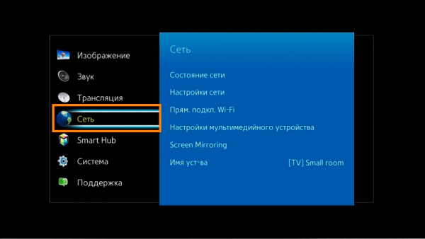 - Accédez à la connexion sur le téléviseur. Prenons l'exemple de Samsung. Vous devez démarrer le téléviseur et utiliser la télécommande pour accéder au menu. Trouvez le bloc "Réseau". Dans la liste de droite, sélectionnez «Paramètres réseau».