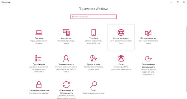 - Vous devrez configurer un serveur DLNA sur le PC. Appuyez sur la combinaison Win + I pour ouvrir la fenêtre "Paramètres Windows". Sélectionnez le 4e carré «Réseau et Internet».