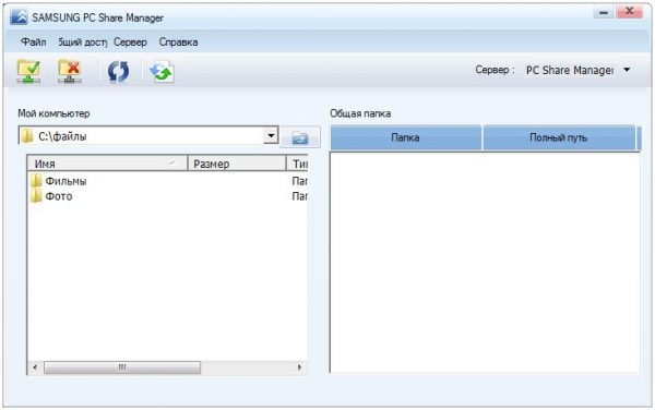 - L'application vous demandera d'afficher des dossiers spécifiques. Par défaut, il s'agit de «Vidéo», «Musique», «Images». Cependant, vous pouvez également spécifier d'autres dossiers dans lesquels des films ou des photos sont stockés afin de pouvoir les regarder ultérieurement sur un écran de télévision. Vous devez cliquer sur le bouton droit "Ajouter" avec un signe plus vert.