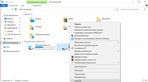 - Connectez-vous à l'Explorateur Windows via l'icône Cet ordinateur sur le bureau. Appuyez sur le disque dur avec le bouton droit et cliquez sur «Propriétés» dans le menu contextuel.