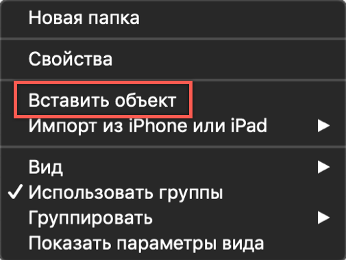 La deuxième option vous permet de vous passer du mode d'affichage divisé, ce qui n'est pas toujours pratique sur les moniteurs à petite diagonale. Dans ce cas, nous cliquons sur l'image sélectionnée pour appeler le menu contextuel. On y retrouve l'élément noté dans la capture d'écran. Nous l'insérons dans le document à l'aide d'une combinaison de touches ou en appelant un menu contextuel similaire.