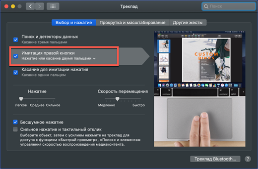 Tous les modèles de MacBook sont équipés d'un trackpad, une surface tactile qui vous permet de travailler avec un ordinateur portable sans souris. Dans ses capacités, il dépasse considérablement les pavés tactiles installés sur les ordinateurs portables avec Windows, car il est conçu pour le contrôle gestuel. L'absence de boutons sur le trackpad simulant le fonctionnement de la souris semble inhabituelle. Par défaut, le menu contextuel est invoqué en cliquant dans le coin inférieur droit de l'écran tactile. Dans les paramètres du trackpad, cette action peut être remplacée par une double touche dans n'importe quelle zone.