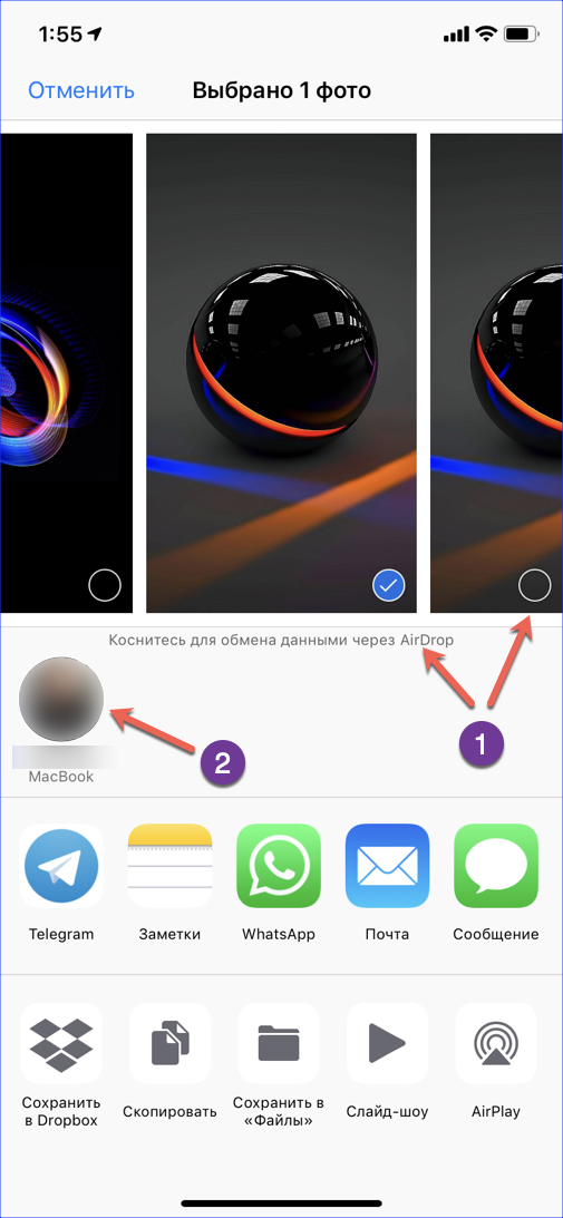 - En cliquant sur le menu «Partager», sous les miniatures avec les indicateurs de sélection, on voit un Mac disponible dans la zone de couverture Bluetooth. Cliquez sur l'icône du portable et envoyez-lui des photos.