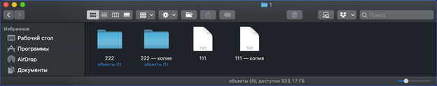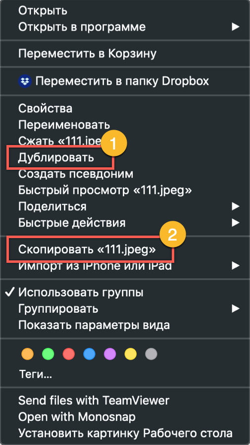 - Le menu contextuel d'action du fichier macOS ne contient pas l'élément «Copier» familier aux utilisateurs de Windows. Ici, nous avons le choix entre deux options: utilisez les commandes "Dupliquer" ou "Copier".