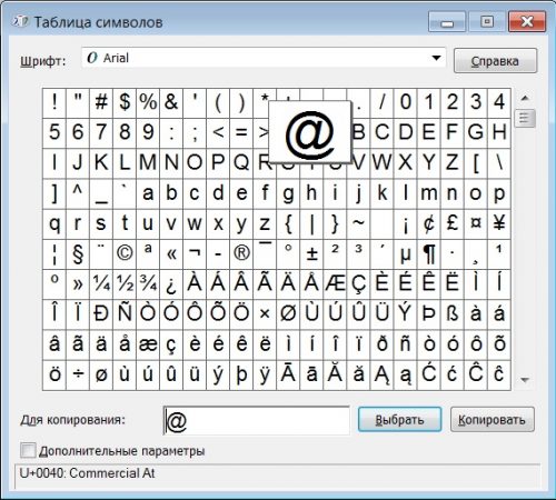 Si les deux méthodes décrites ci-dessus ne fonctionnent pas pour vous, passez à la troisième. Elle consiste à utiliser une table windows. Pour l'ouvrir, vous devez aller dans le menu "Démarrer", y sélectionner des programmes standard, trouver ceux utilitaires, où se trouve la table. Il y aura certainement une icône «chien» dans la liste, que vous pouvez facilement copier et coller dans votre texte ou votre adresse. Pour ce faire, sélectionnez le signe - il apparaîtra dans le champ ci-dessous, puis cliquez sur le bouton "Copier". Ouvrez maintenant votre document ou votre page Web et collez simplement @.