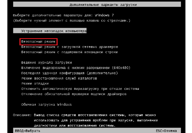- Démarrez le "Mode sans échec" en le sélectionnant dans les paramètres et en appuyant sur le bouton F8. Selon les paramètres, d'autres touches avec la lettre F peuvent également être utilisées.S'il n'y a pas d'ouverture instantanée de la fenêtre requise, il vaut la peine d'utiliser les lettres à tour de rôle jusqu'à ce que celle correspondante apparaisse.
