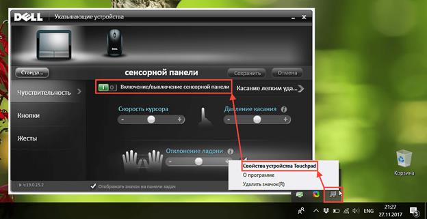 L'écran tactile peut être désactivé sur n'importe quel ordinateur portable, même les versions les plus anciennes à l'aide d'un logiciel de base. Ainsi, avec une licence Windows 10 est livré avec un logiciel spécial sous la forme d'un utilitaire de pilote intégré de Synaptics. Vous pouvez voir ce programme installé dans la barre des tâches - le coin inférieur droit. Vous pouvez ouvrir l'utilitaire en utilisant le bouton droit de la souris, en sélectionnant l'élément désactiver / activer dans le menu déroulant.