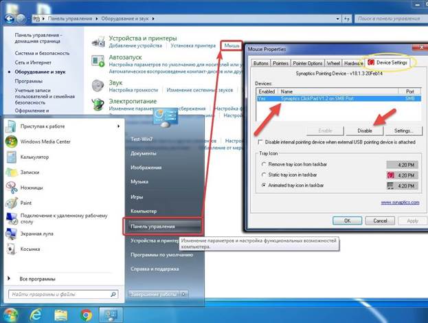 S'il n'y a pas d'icône dans la barre des tâches, vous devez aller dans «Pyck», puis sélectionner l'élément «Paramètres», ouvrir l'onglet «Périphériques», où le «Menu des périphériques» s'ouvre. Dans la version 7 du système d'exploitation Windows, vous pouvez ouvrir l'utilitaire selon ce principe: Démarrer - Paramètres - Panneau de configuration - Matériel et audio - Souris. Il existe un autre logiciel qui vous permet de désactiver le pavé tactile, mais meilleur que celui d'origine.