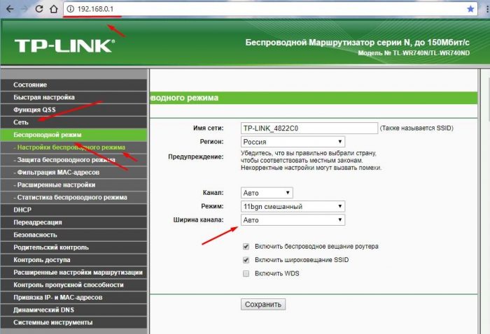 Après être entré dans le menu du routeur, accédez au «Mode sans fil». Après cela, une fenêtre contextuelle s'ouvrira avec des paramètres supplémentaires, dans lesquels vous devrez sélectionner «Largeur de canal». La fonction de recherche automatique doit être remplacée par toute autre.