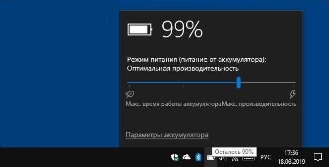 Dans le système d'exploitation Windows, les informations sur la batterie peuvent être consultées en regardant la barre d'état système. Si l'icône apparaît sous la forme d'une prise électrique, cela indique que la batterie est connectée au chargement (ou qu'elle est déjà pleine). En survolant, l'utilisateur reçoit des informations sur l'état actuel de la batterie.