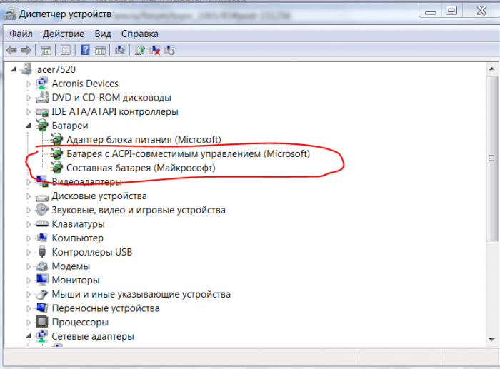 - Dans le "Gestionnaire de périphériques", vous devez trouver la section "Batteries", qui contient la sous-section "Batterie avec gestion compatible ACPI" (le nom peut varier légèrement).
