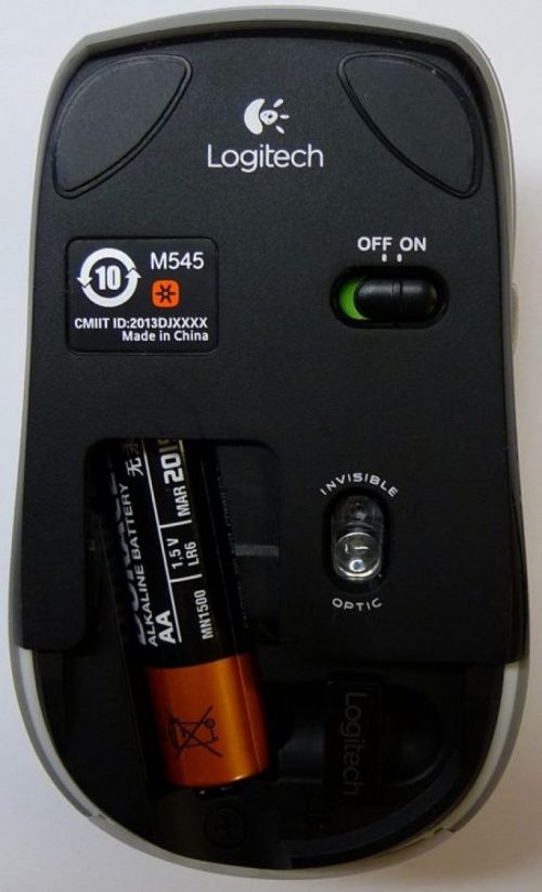 - Tout d'abord, insérez les piles dans la souris. La fente est située dans sa partie inférieure. Retournez-le, soulevez le couvercle avec des loquets ou appuyez sur le bouton prévu à cet effet. Maintenant, nous mettons les piles appropriées dans la fente, en suivant les instructions pour leur emplacement. Le plus souvent utilisé de type AAA ou AA. Fermez le couvercle du compartiment et allumez la souris (interrupteur sur le côté ou en bas). Respectez la polarité des piles afin de ne pas endommager l'appareil.