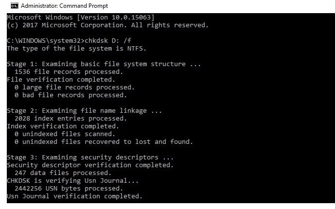 - Dans la barre de recherche du menu Démarrer, entrez la commande chkdsk avec: / f.